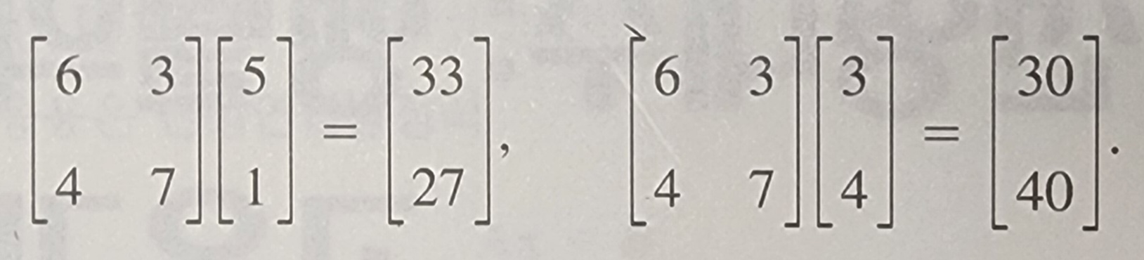 반면, 오른쪽의 경우, 행렬의 곱이 원래 벡터와 같은 방향을 갖는 벡터(배율)를 주었다.